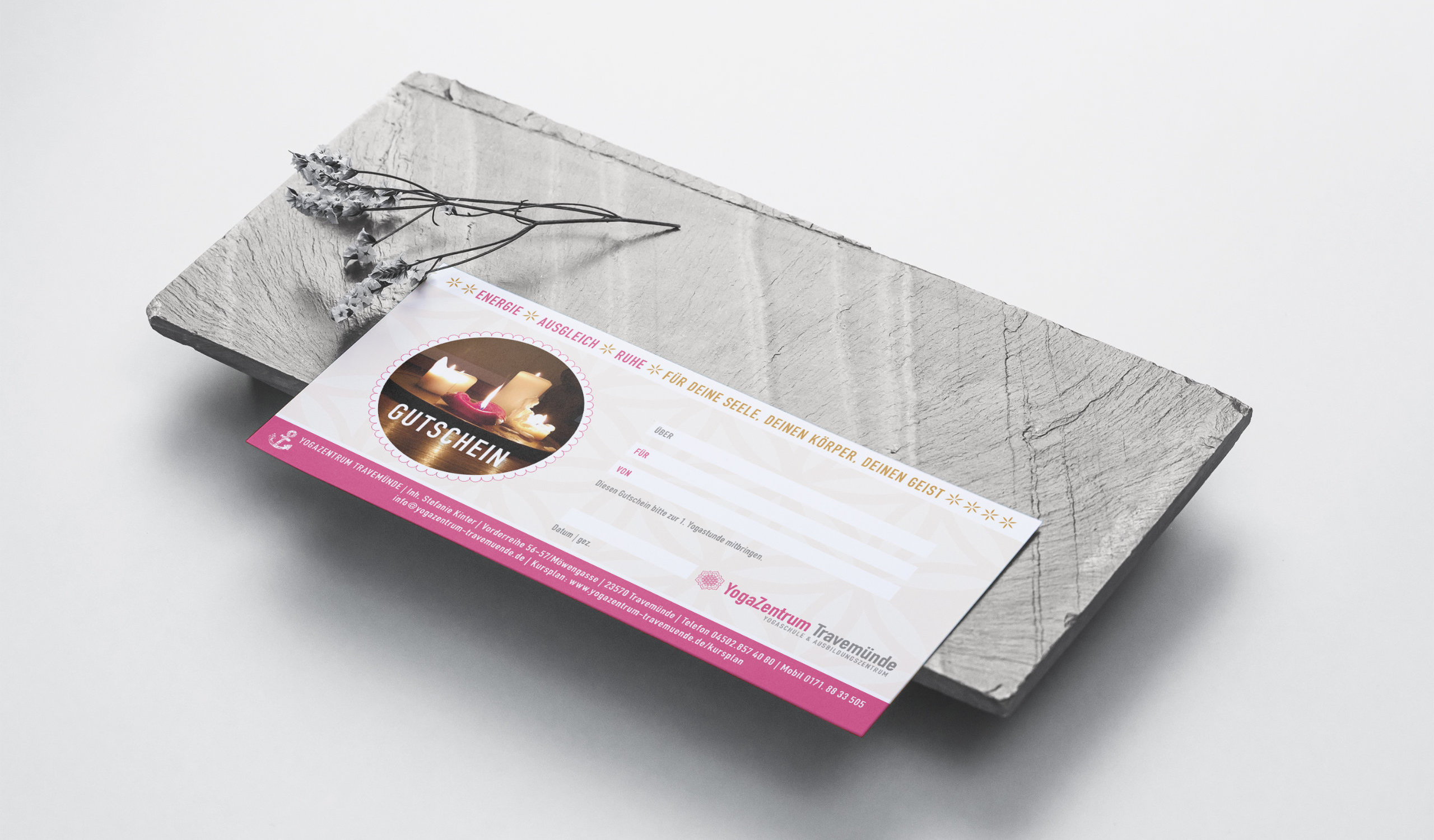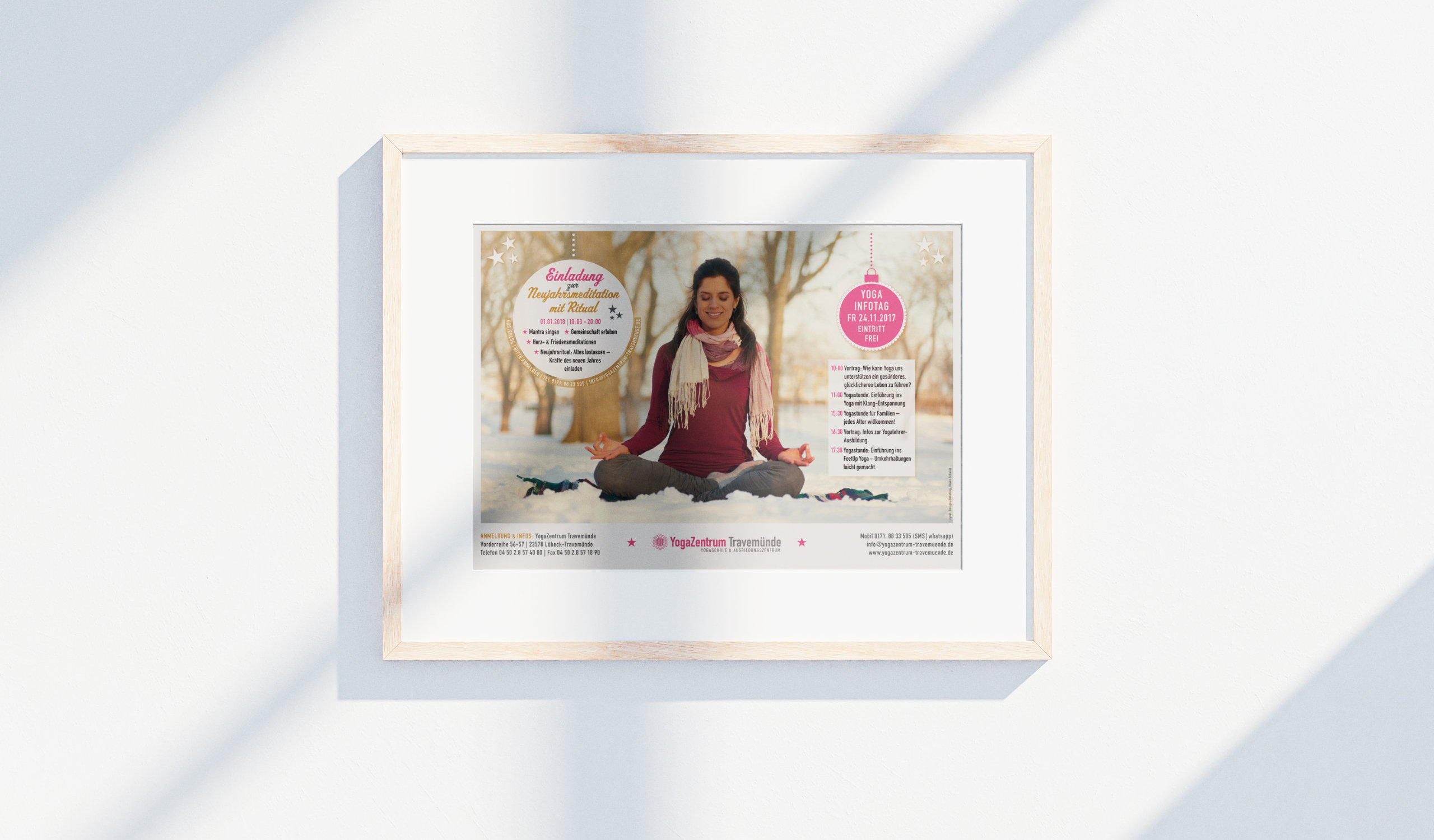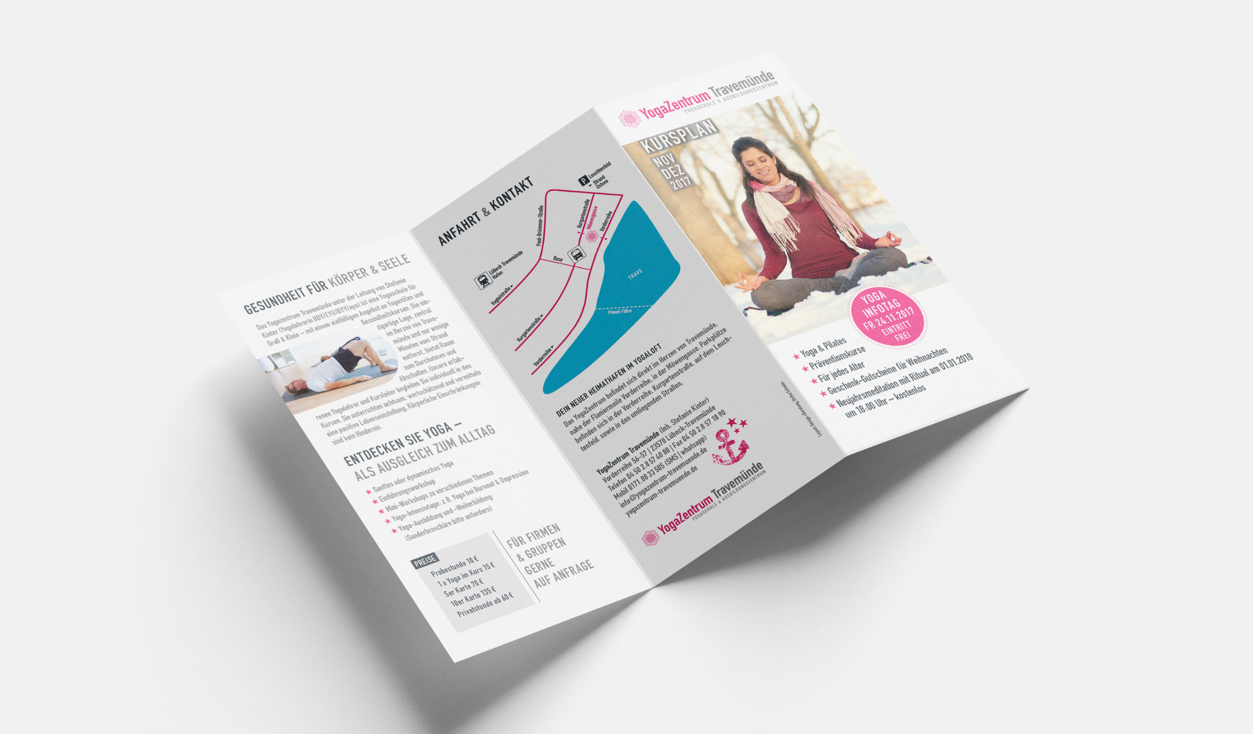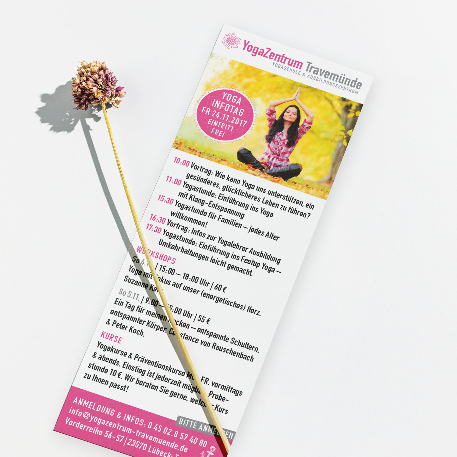 Entwicklung verschiedener Werbemittel, wie Flyer und Plakate für das Yogazentrum Travemünde, um Kunden zu generieren und auf sich aufmerksam zu machen.
