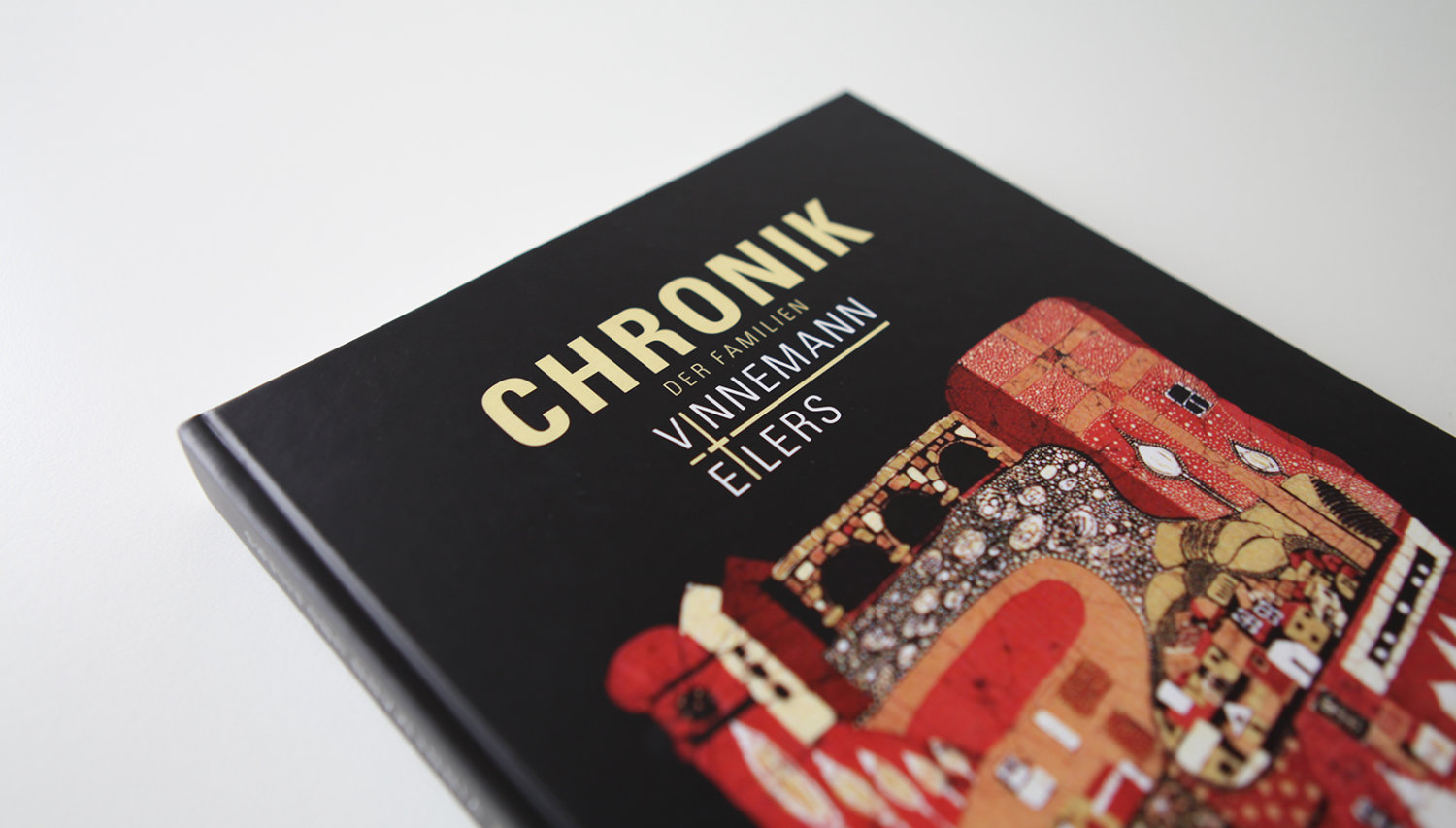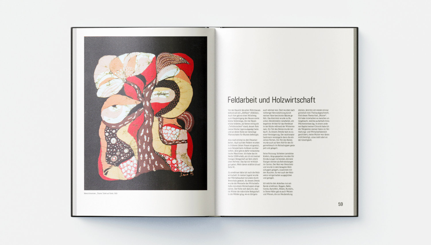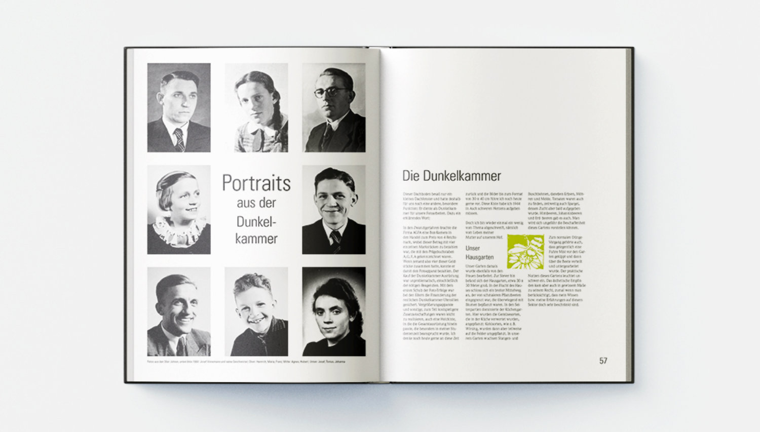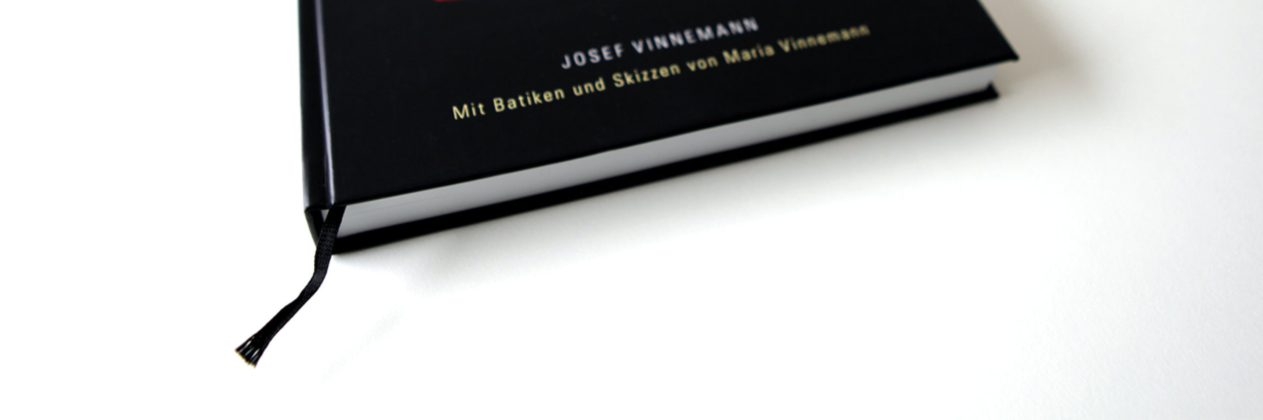 Darstellung der Familiengeschichte von Familie Vinnemann mit Batiken und Illustrationen, typografisch ausdrucksstark gesetzten Zitaten sowie dokumentarischen Schwarz-Weiß-Fotos.