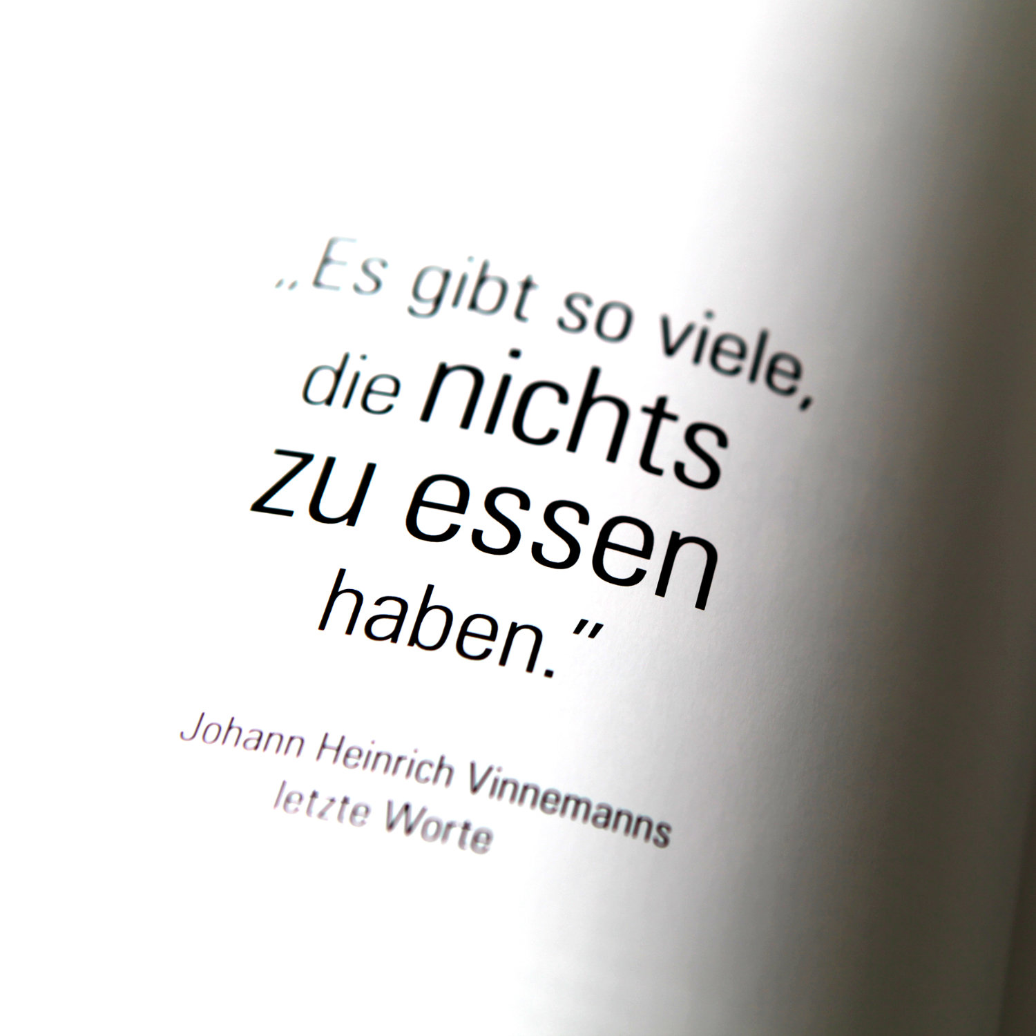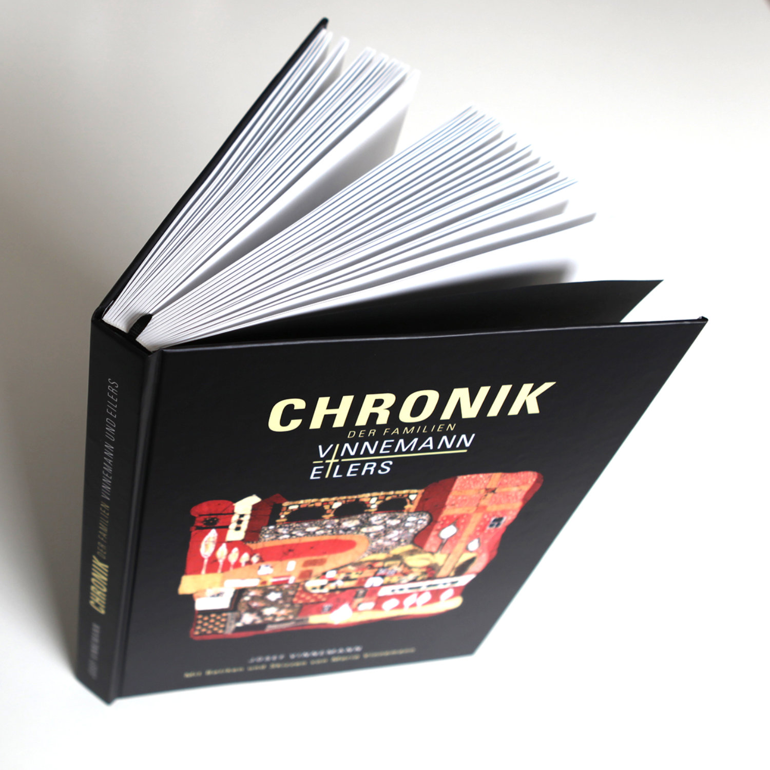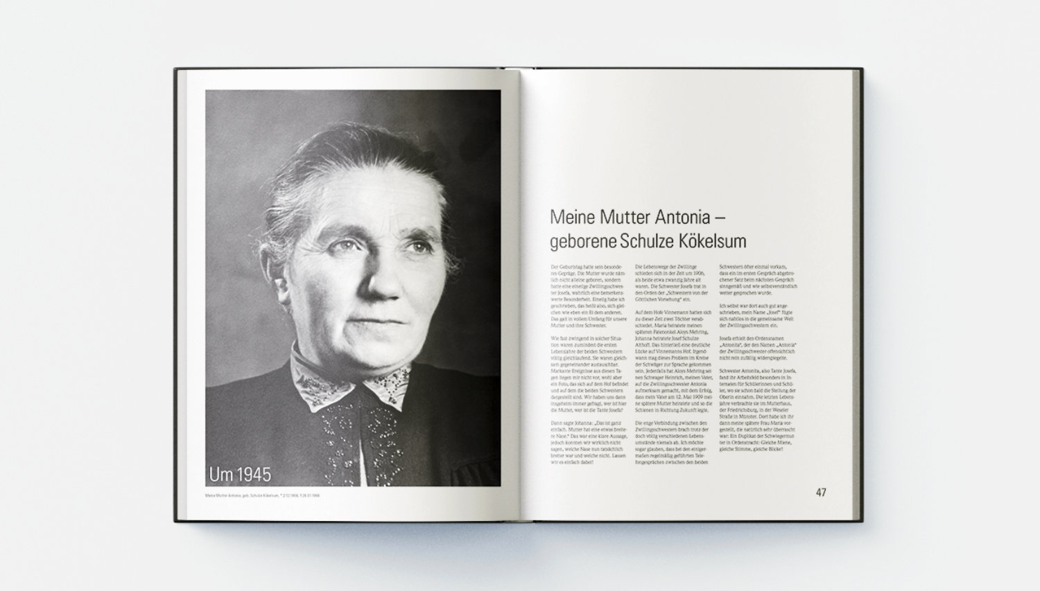 Darstellung der Familiengeschichte von Familie Vinnemann mit Batiken und Illustrationen, typografisch ausdrucksstark gesetzten Zitaten sowie dokumentarischen Schwarz-Weiß-Fotos.