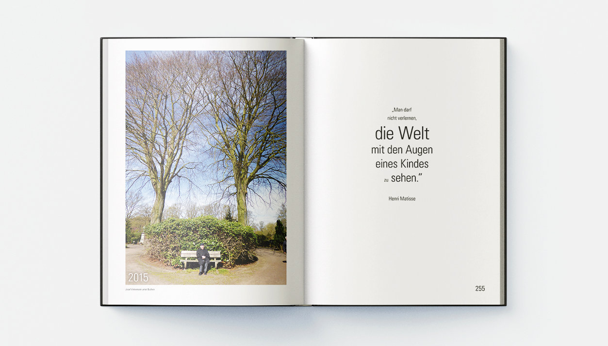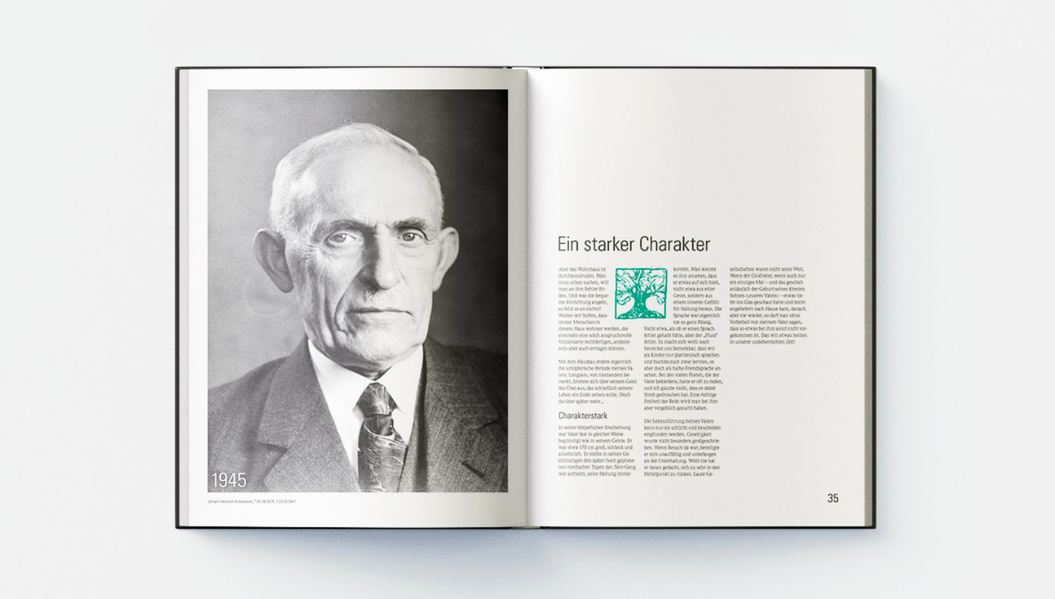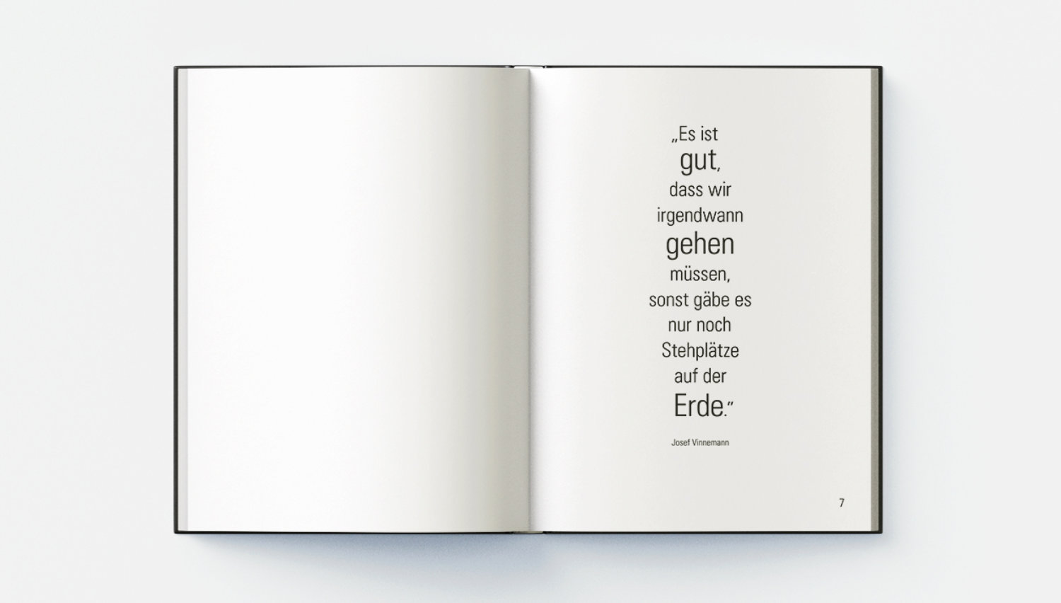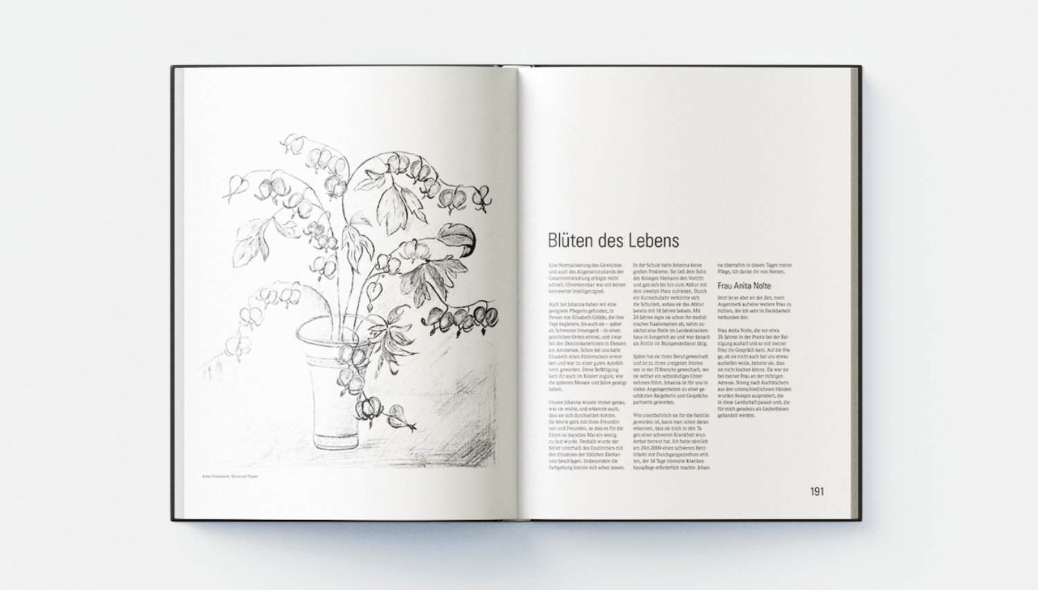 Darstellung der Familiengeschichte von Familie Vinnemann mit Batiken und Illustrationen, typografisch ausdrucksstark gesetzten Zitaten sowie dokumentarischen Schwarz-Weiß-Fotos.